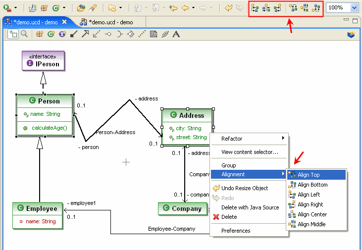 eUML2 allows you to select a group of elements and to arranges the alignment.